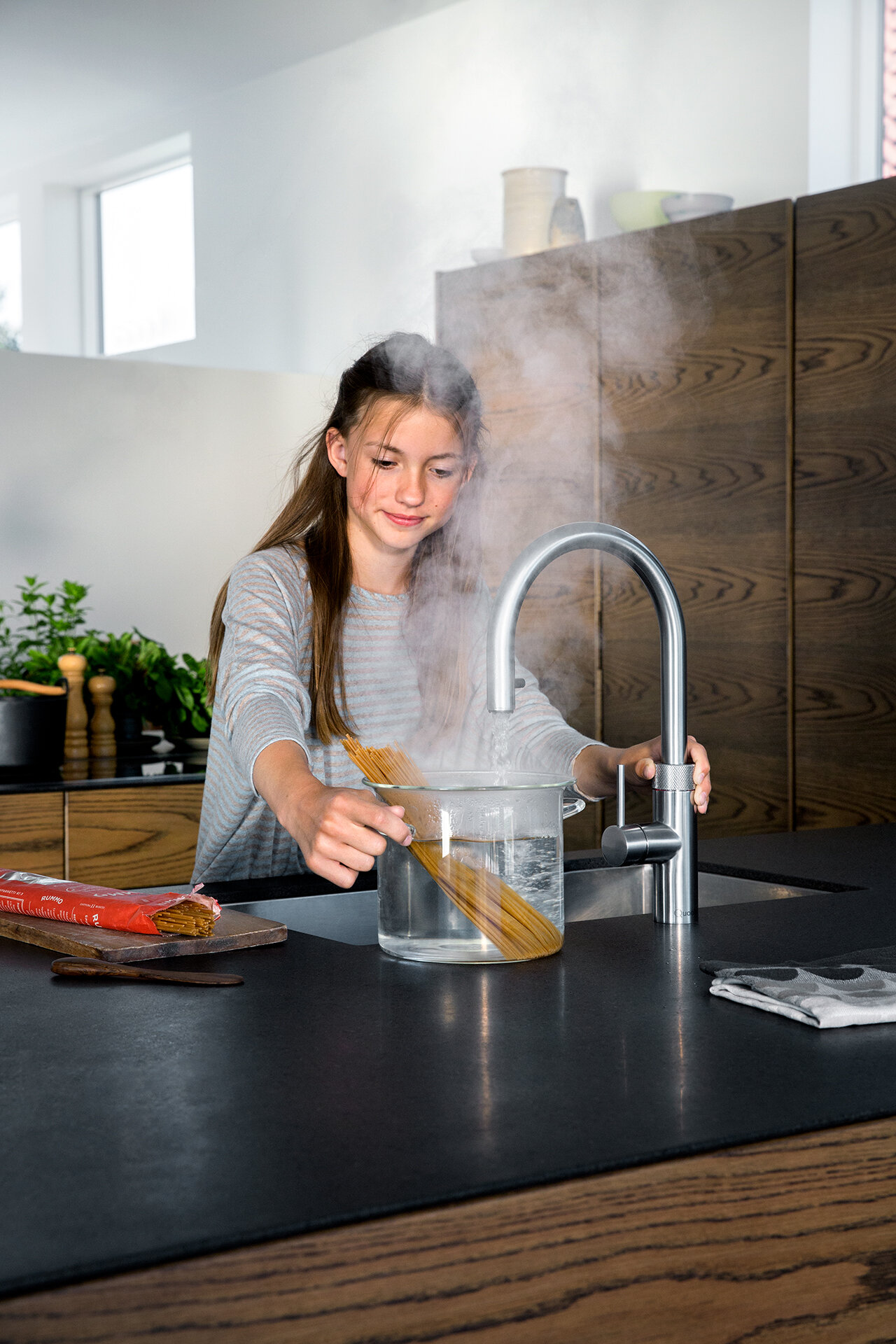 Dzięki zaawansowanej technologii zbiornika pod zlewem, Quooker dostarcza wrzątek od razu po odkręceniu kranu. To idealne rozwiązanie do przygotowania herbaty, kawy, makaronu, a także do szybkiego gotowania czy wyparzania naczyń.